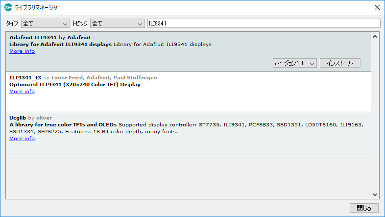 - 右の画像は「ILI9341」とフィルターに入力し、一番上のAdafruit_ILI9341をクリックした画面の例です。(クリックで拡大)
