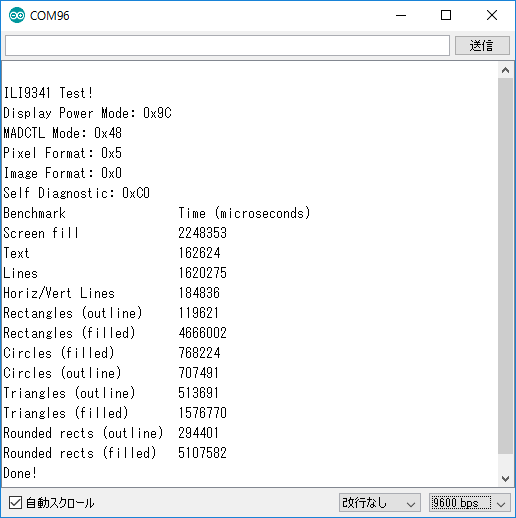 - 直線、文字、長方形、円などの描画を行い、処理時間をシリアルコンソールに出力